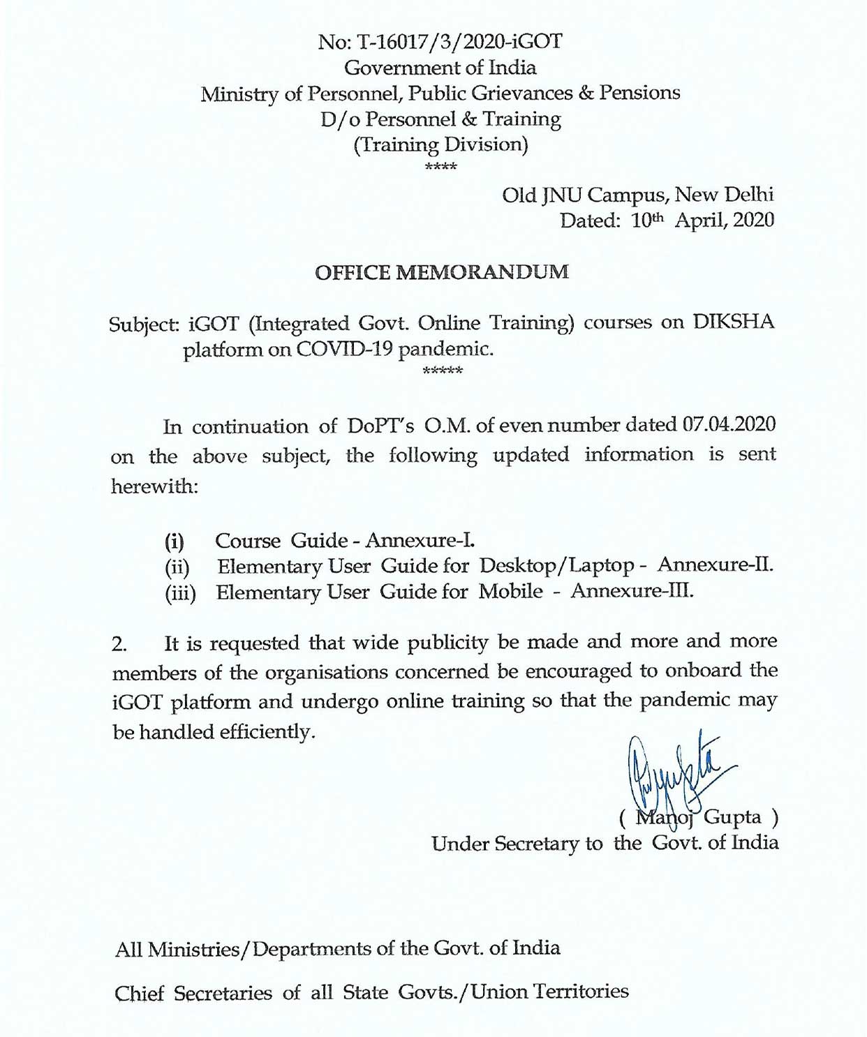 Office Memorandum - iGot (Integrated Govt. Online Training) courses on DIKSHA platform on COVID-19 pandemic.